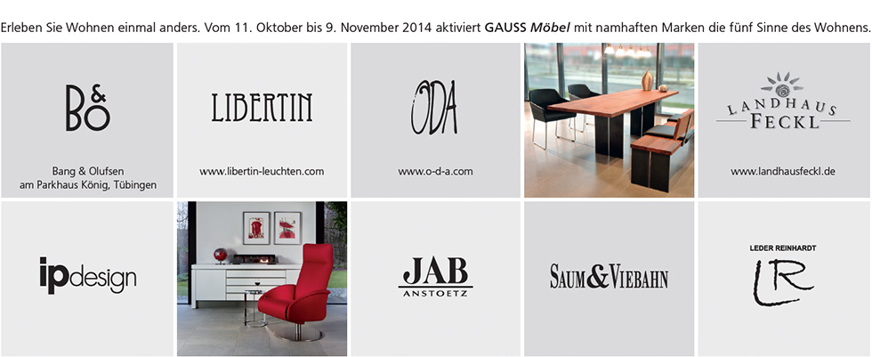 Vom 11. Oktober bis 9. November finden zum Holzgerlinger Herbst die GAUSS-Erlebniswochen 2014 statt. Neue Kreationen handgearbeiteter Möbel werden beispielhaft in einem aktuellen Lifestyle-Umfeld präsentiert. Wohnlichkeit wird durch die fünf Sinne lebendig. Besuchen Sie uns auf dem Holzgerlinger Herbst und auf den GAUSS-Erlebniswochen!